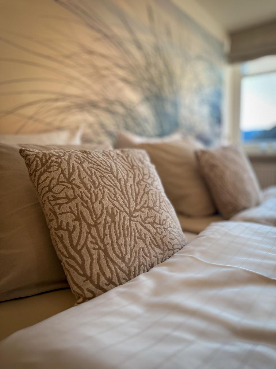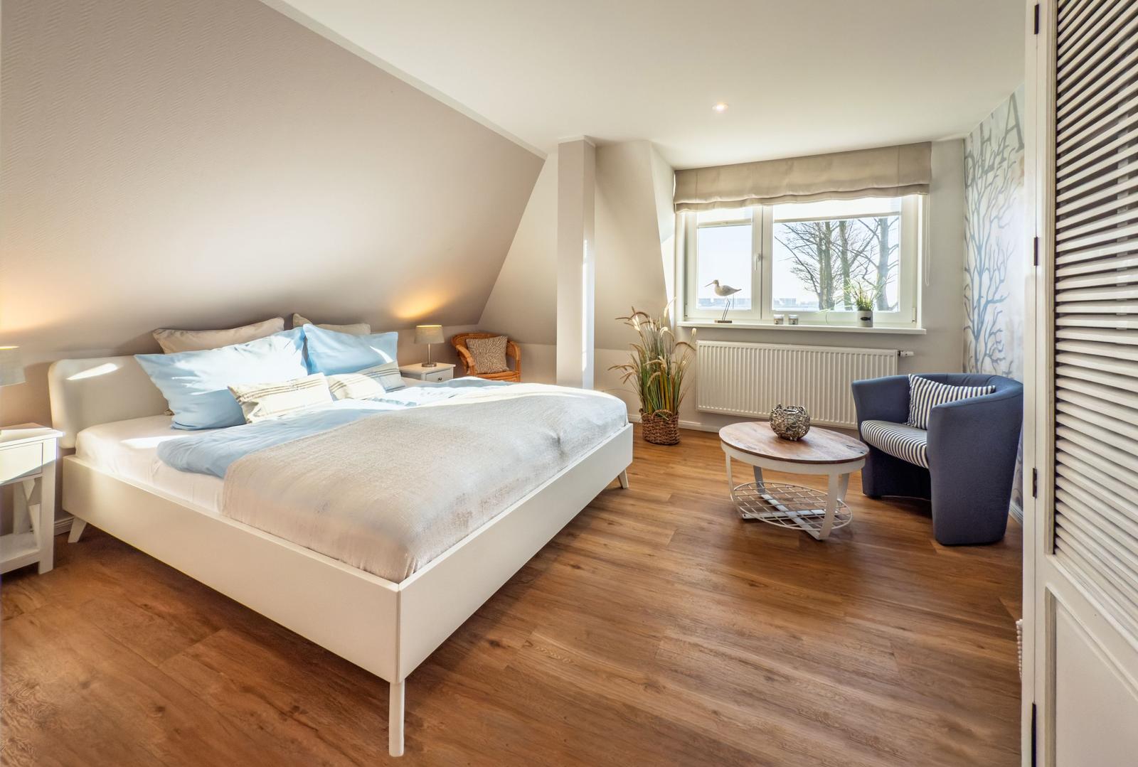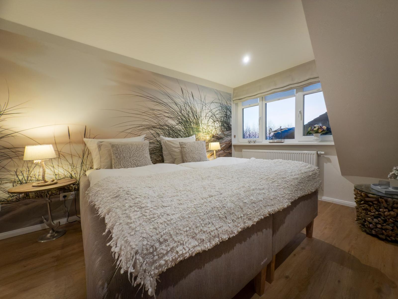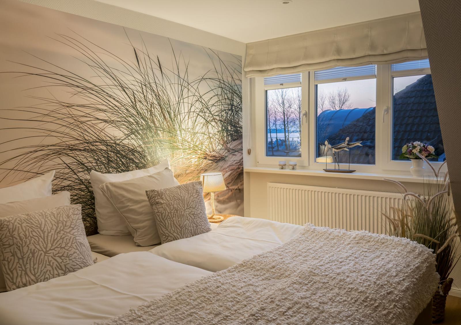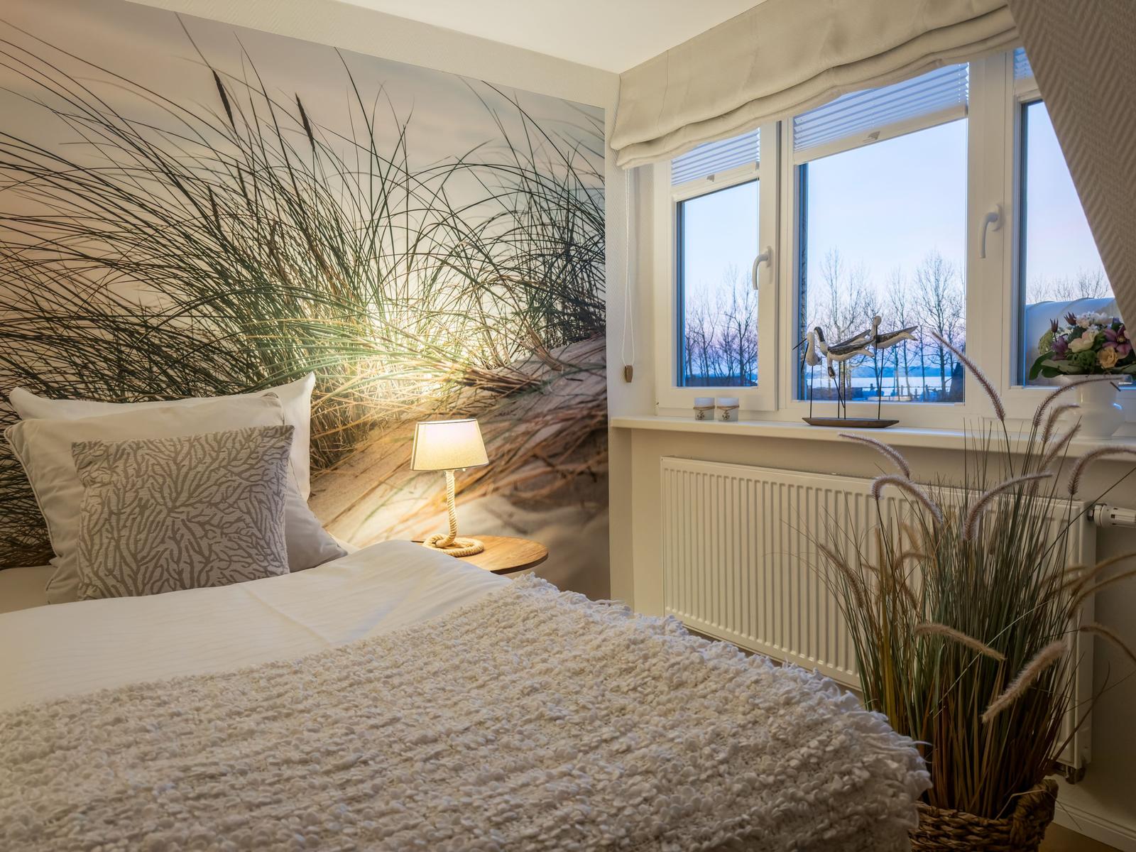 Sie verfügt über 2 Schlafräume mit Doppelbetten, ein Wohnzimmer mit Blick auf den Binnensee, eine separate Küche und ein Duschbad. Eine helle, moderne- Allergikerfreundlich und komfortable Wohnung mit maritimen Charm lässt keine Wünsche offen.