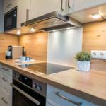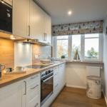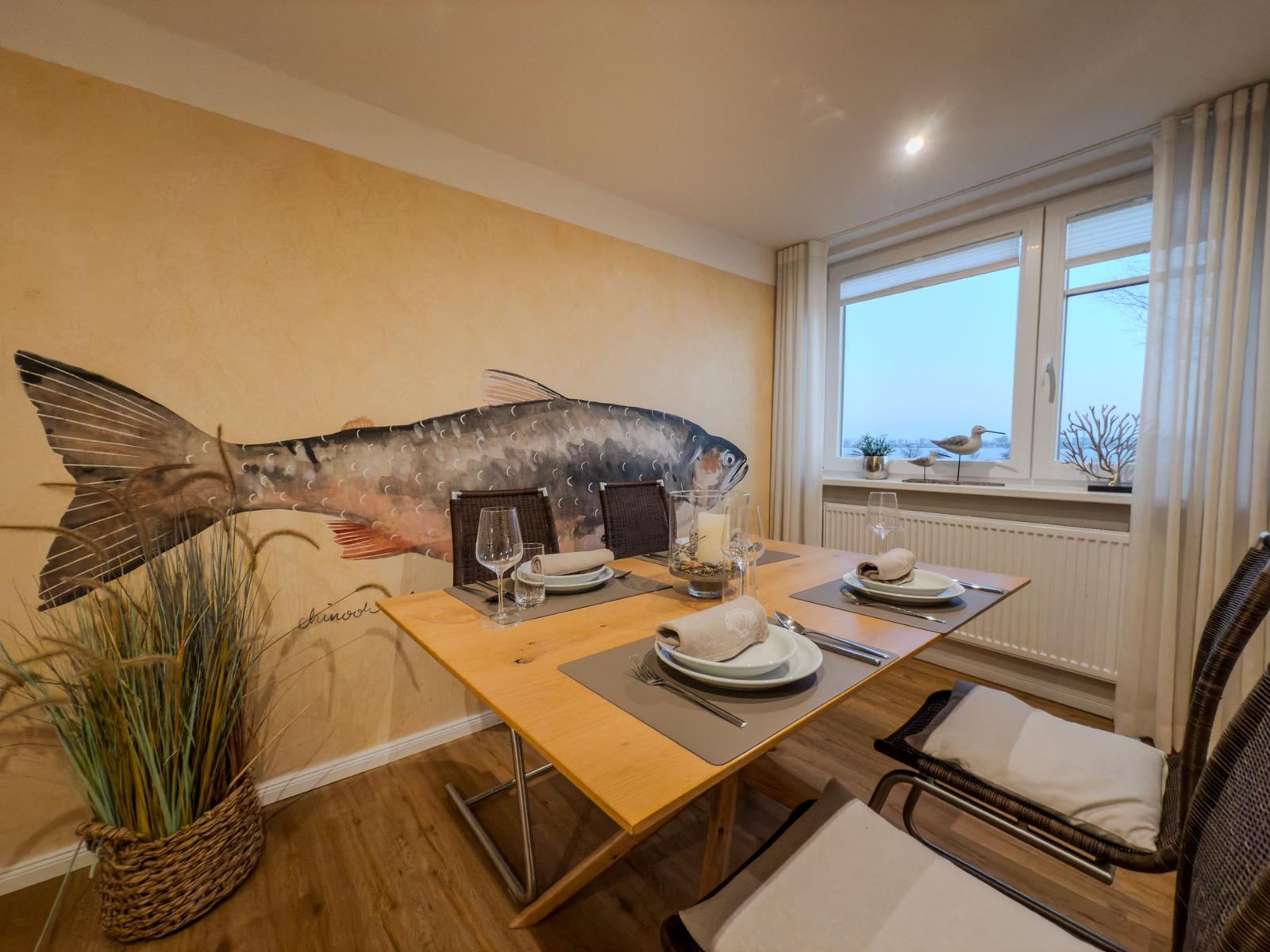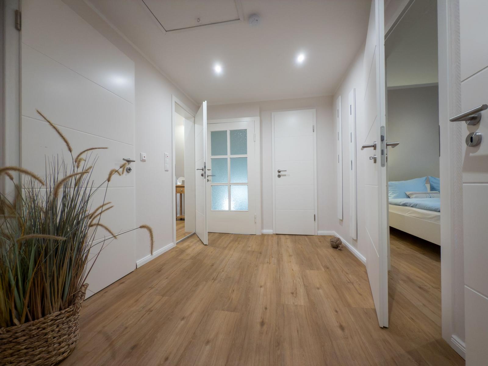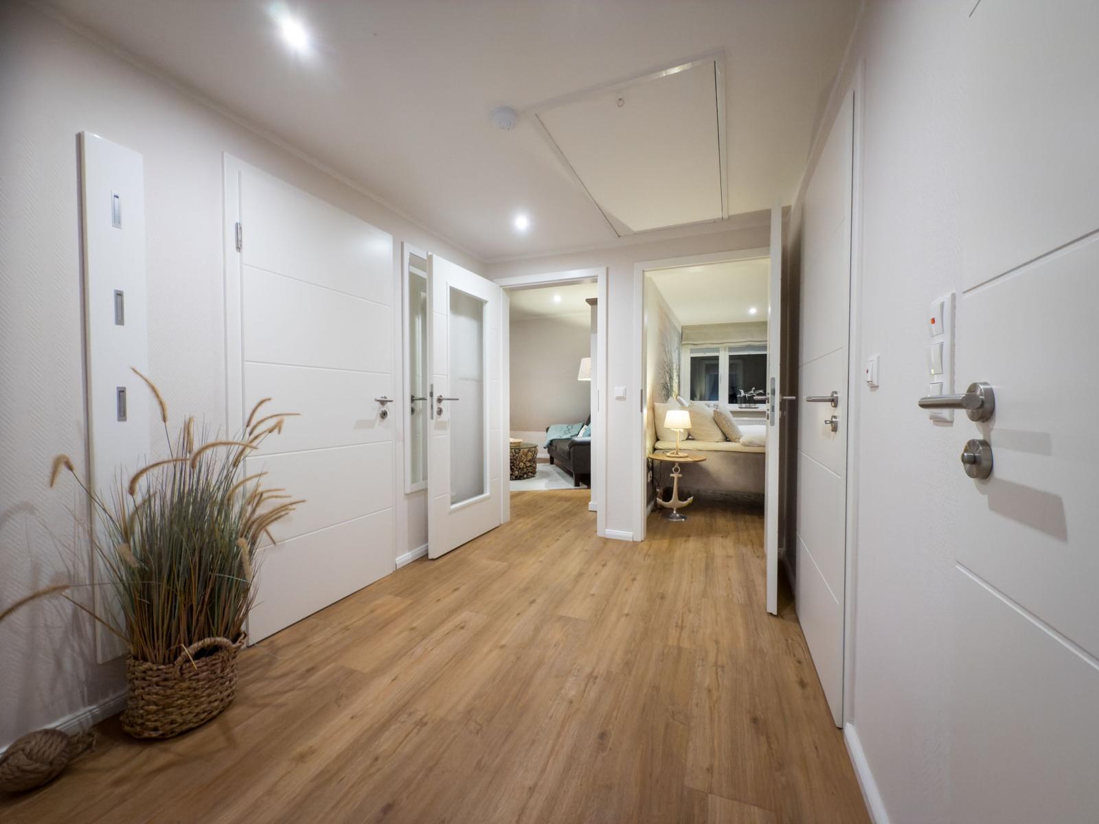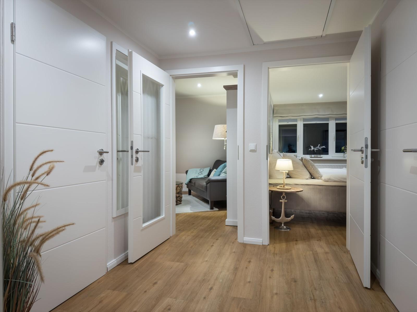 Sie verfügt über 2 Schlafräume mit Doppelbetten, ein Wohnzimmer mit Blick auf den Binnensee, eine separate Küche und ein Duschbad. Eine helle, moderne- Allergikerfreundlich und komfortable Wohnung mit maritimen Charm lässt keine Wünsche offen.