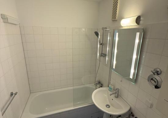 Das Bad ist mit einer Dusche, einem Handtuchheizkörper und einem Wandspiegel ausgestattet.