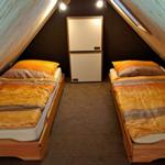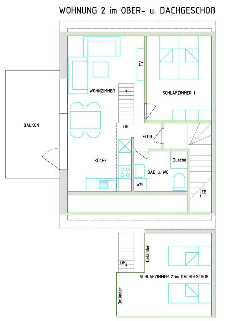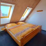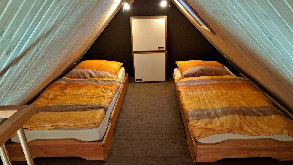 Das Schlafzimmer ist mit einem Doppelbett und Kleiderschrank eingerichtet. Zwei weitere Schlafplätze befinden sich auf dem ausgebauten Spitzboden, der über eine steile Spartreppe erreichbar ist.