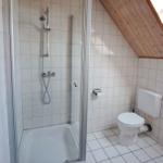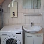 Das Badezimmer verfügt über Dusche, Waschbecken, WC sowie eine Waschmaschine.