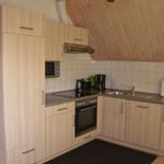 Die voll ausgestattete, integrierte Küchenzeile lässt keine Wünsche offen: vorhanden sind unter anderem Backofen, Mikrowelle, Kochfelder, Spülmaschine, Kühlschrank mit Gefrierfach, Kaffeemaschine, Wasserkocher, Toaster, Eierkocher sowie ausreichend Geschirr, Besteck, Töpfe und Pfannen.