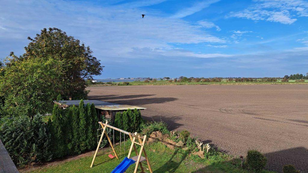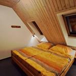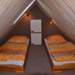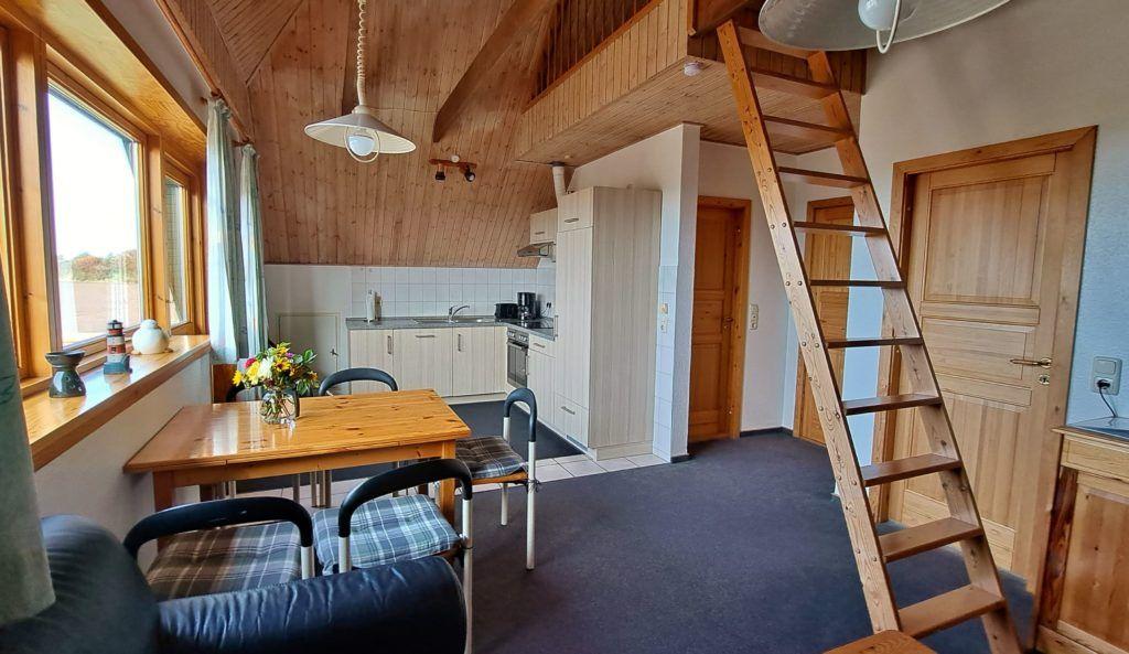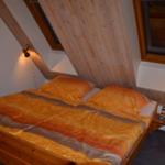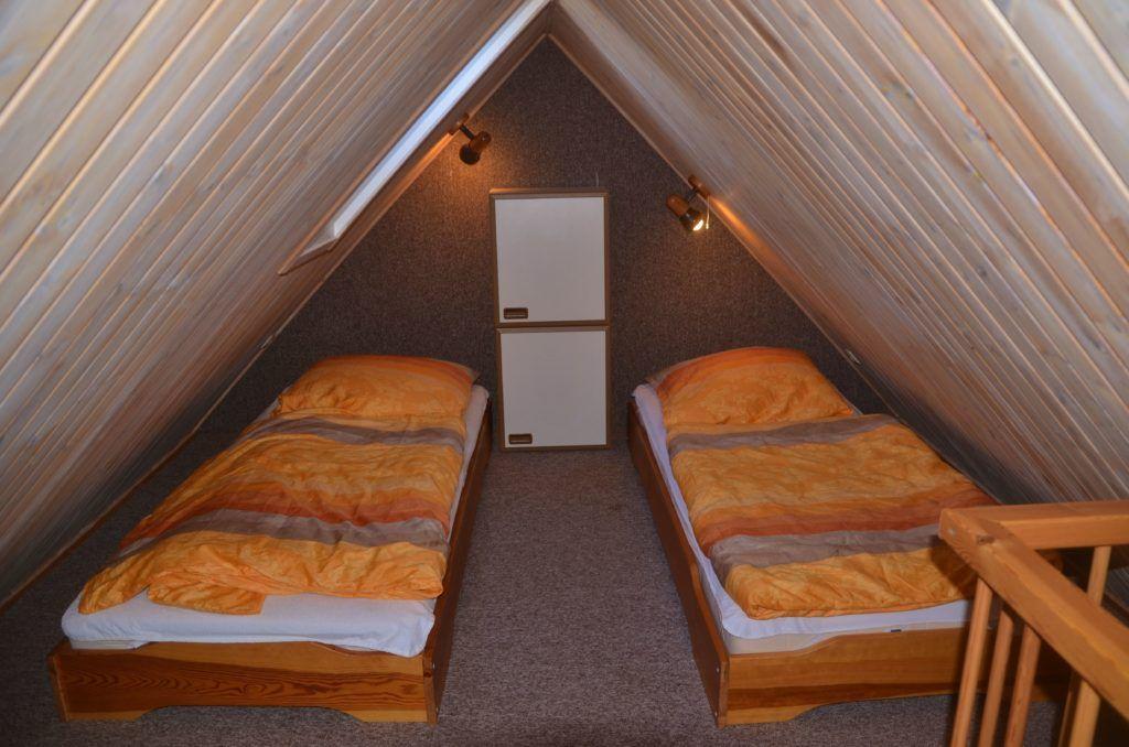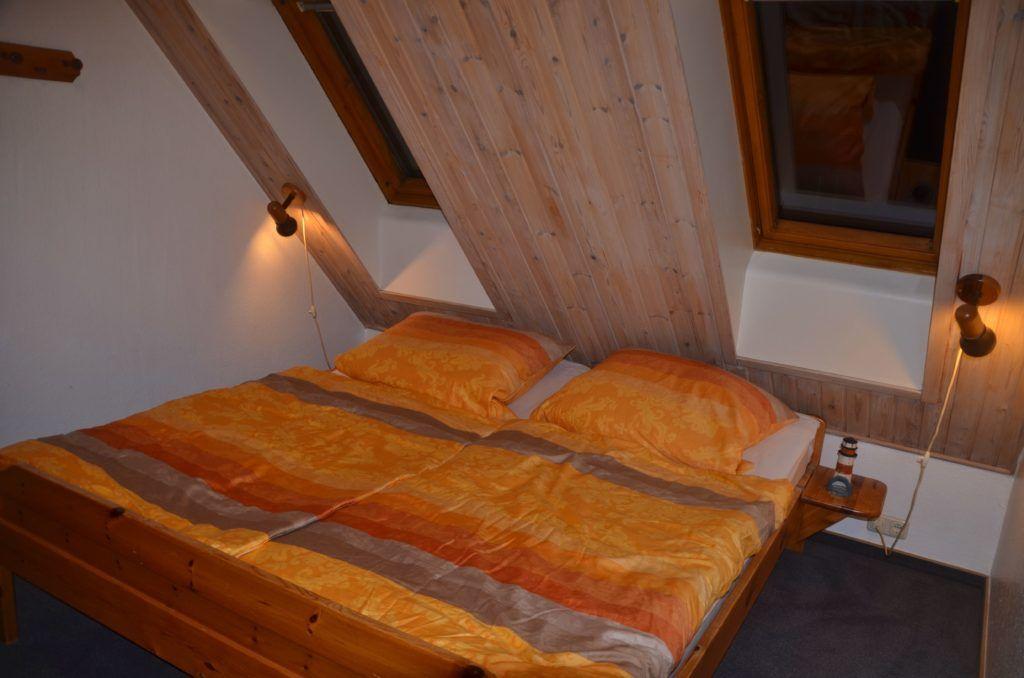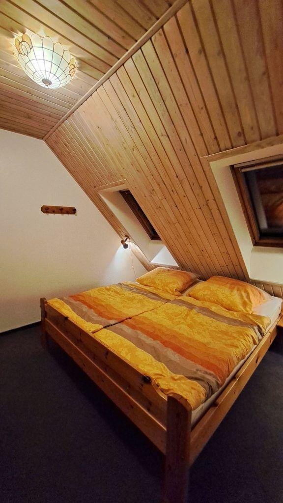 Das Schlafzimmer ist mit einem Doppelbett und Kleiderschrank eingerichtet. Zwei weitere Schlafplätze befinden sich auf dem ausgebauten Spitzboden, der über eine steile Spartreppe erreichbar ist.