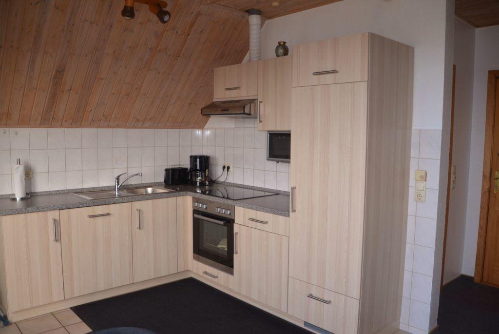 Die voll ausgestattete, integrierte Küchenzeile lässt keine Wünsche offen: vorhanden sind unter anderem Backofen, Mikrowelle, Kochfelder, Spülmaschine, Kühlschrank mit Gefrierfach, Kaffeemaschine, Wasserkocher, Toaster, Eierkocher sowie ausreichend Geschirr, Besteck, Töpfe und Pfannen.