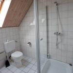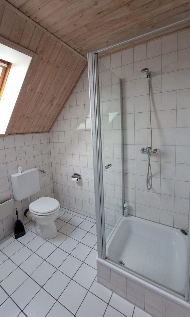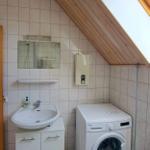 Das Badezimmer verfügt über Dusche, Waschbecken, WC sowie eine Waschmaschine.